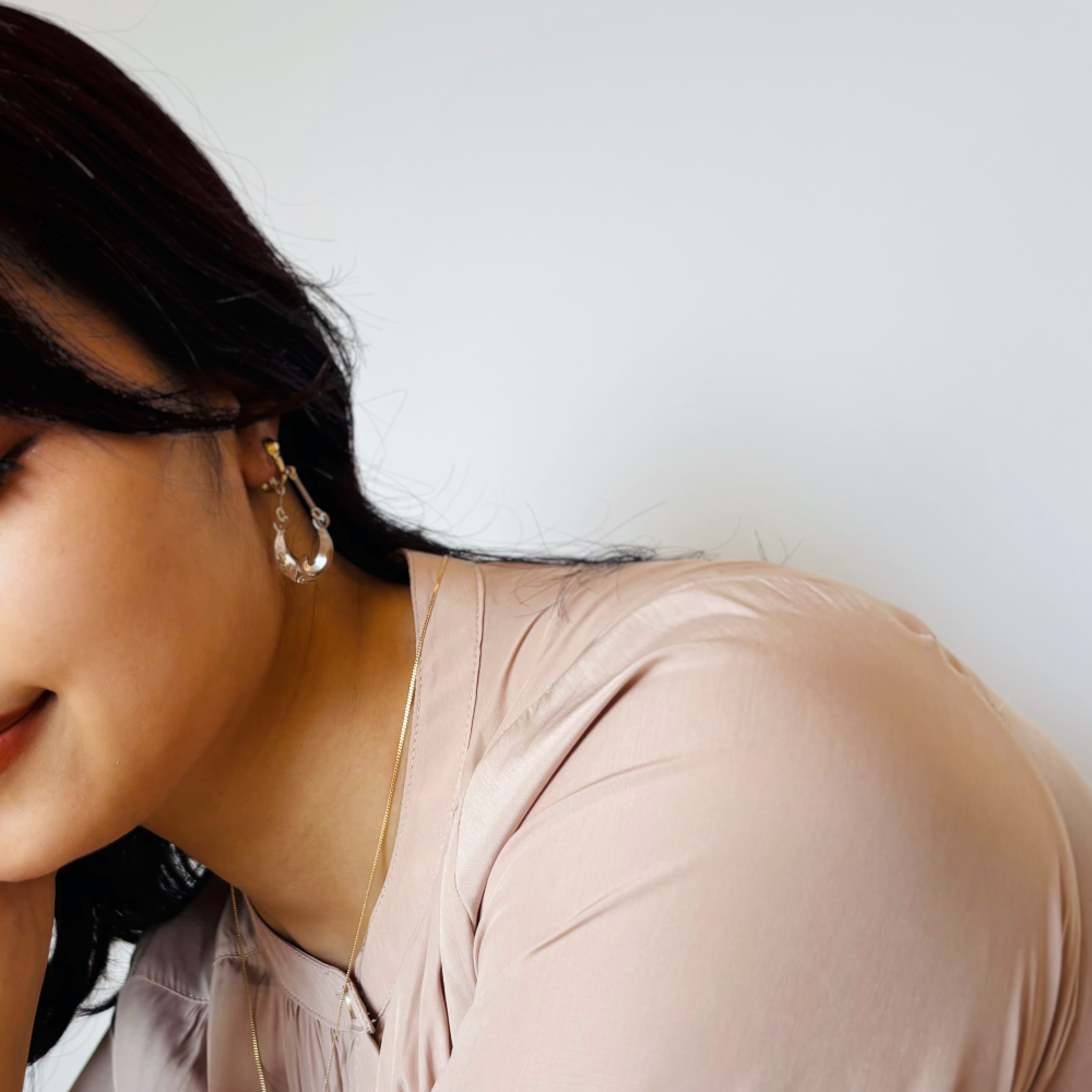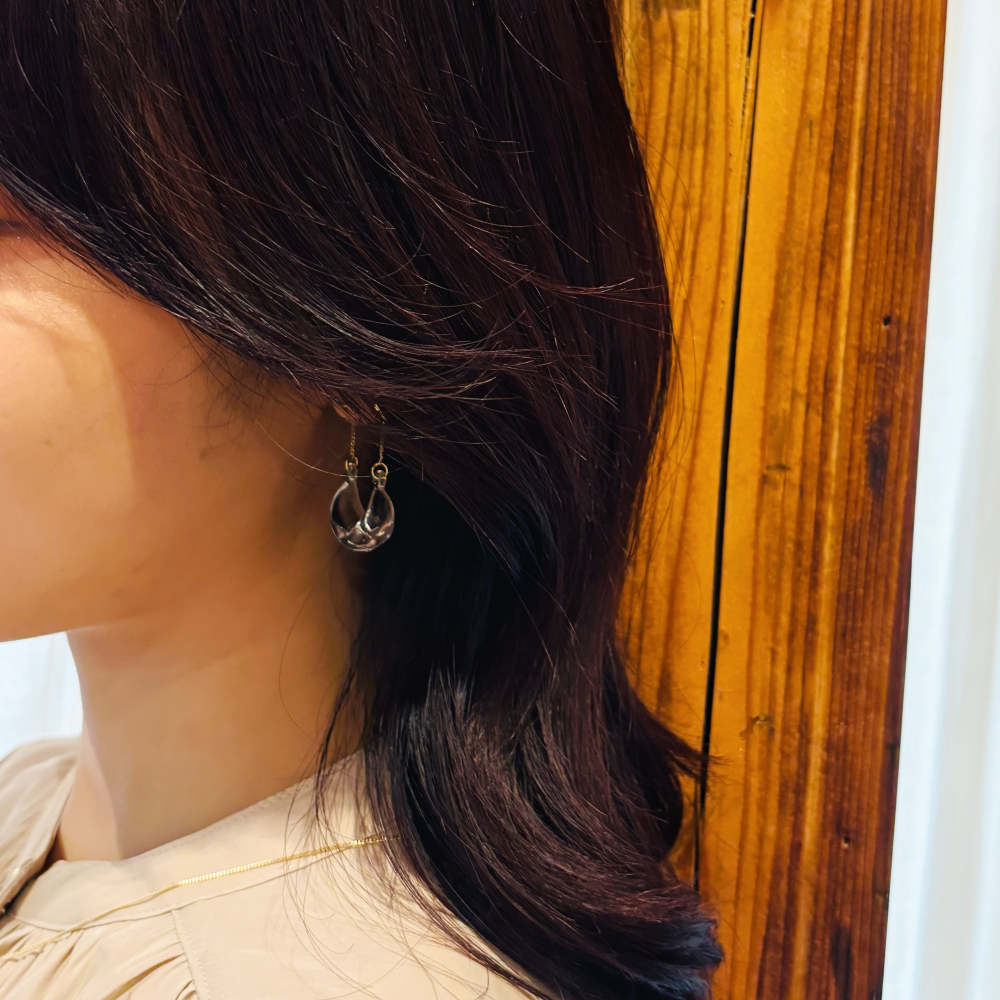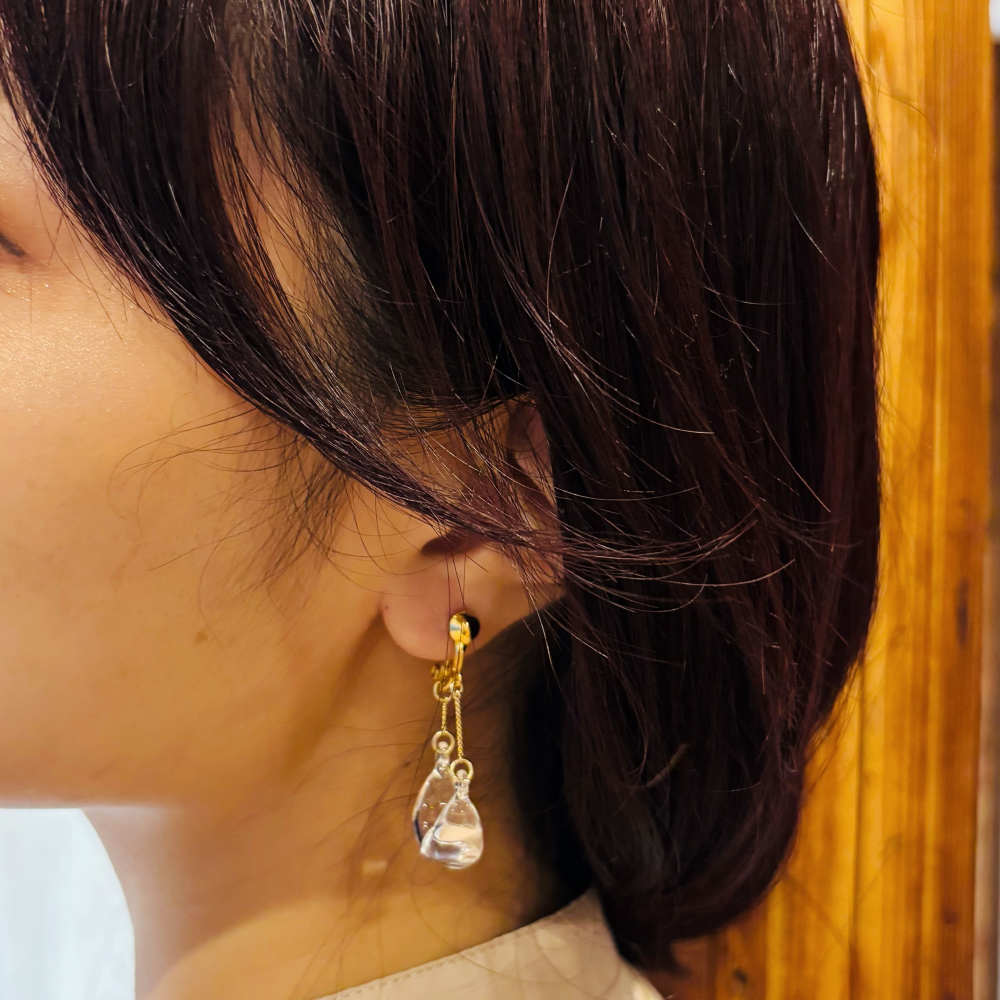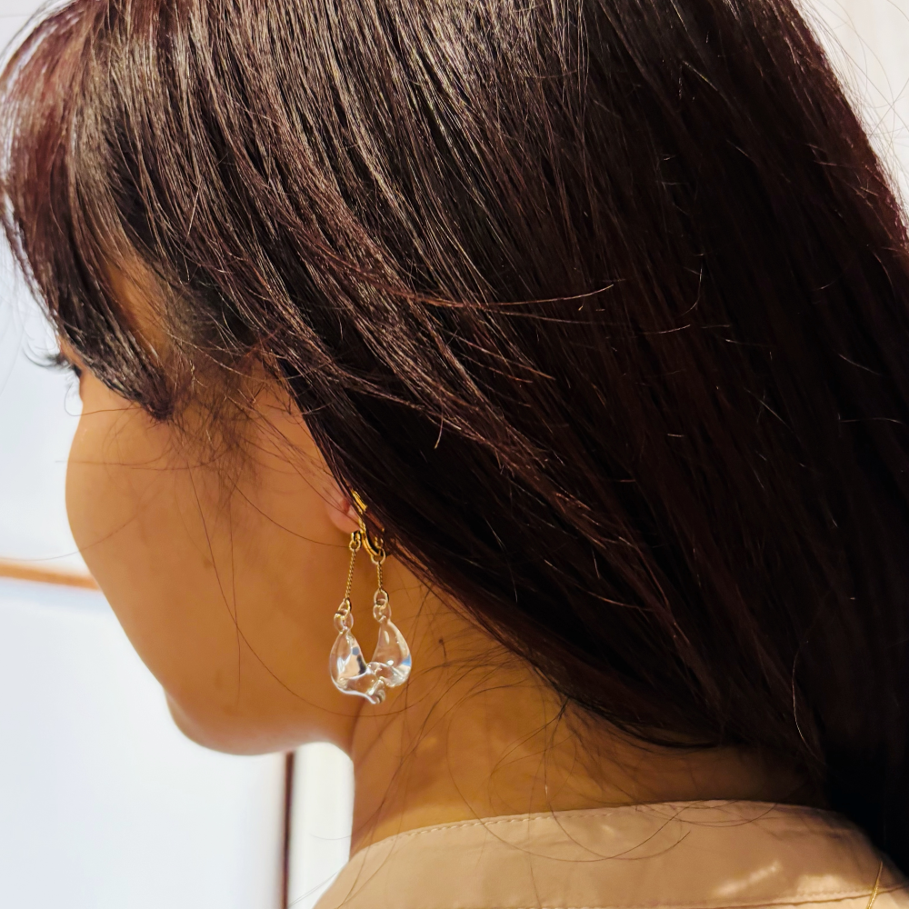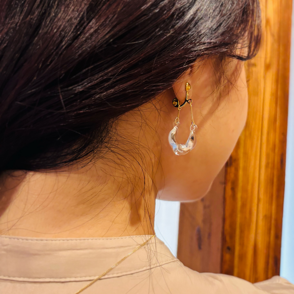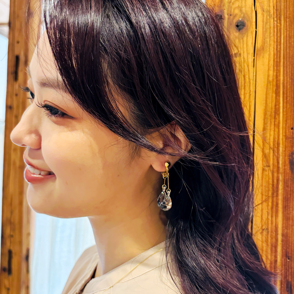 イヤリングパーツには、耳の厚みに合わせて微調整が可能なカシメ式のパーツを使用しています。