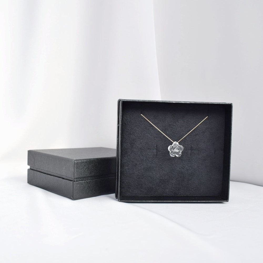 iriserのある南相馬市小高区のまちの花・紅梅をモチーフにしたガラスのネックレス。