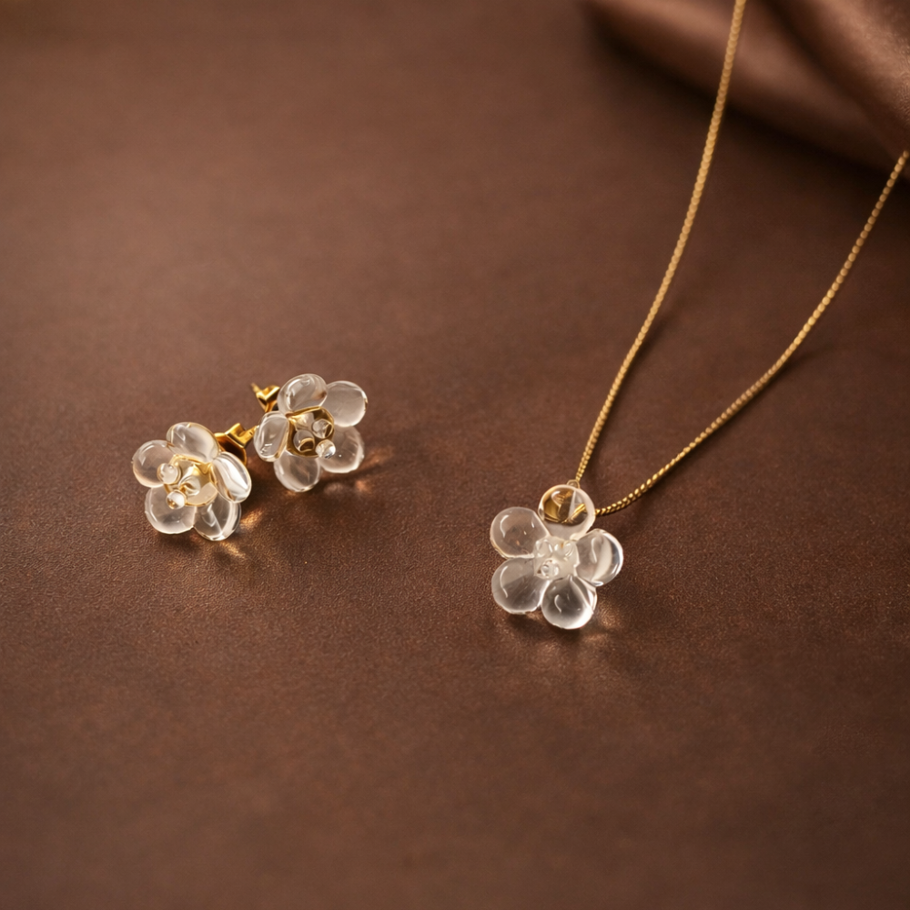 iriserのある南相馬市小高区のまちの花・紅梅をモチーフにしたガラスのネックレス。