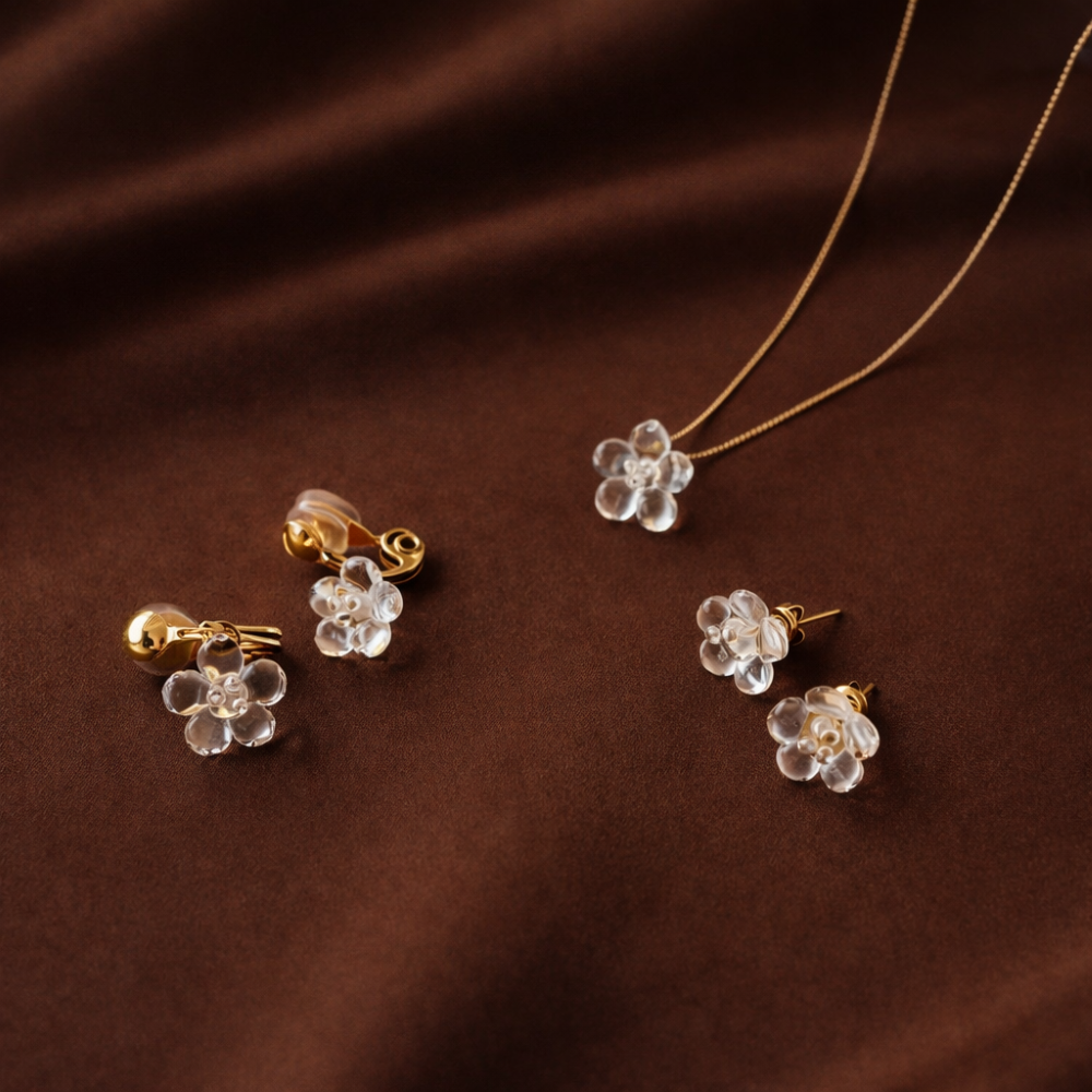 | サイズ | [ネックレス]ガラスサイズ:12×12×9(mm) チェーン長さ:50cm(スライドボール使用) [ピアス]ガラスサイズ:12×12×8(mm) |