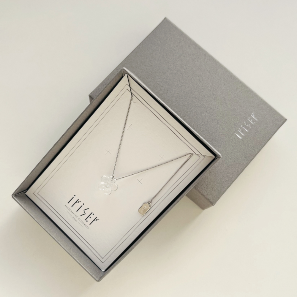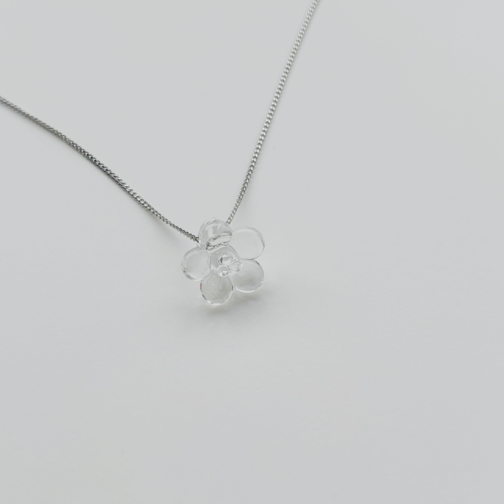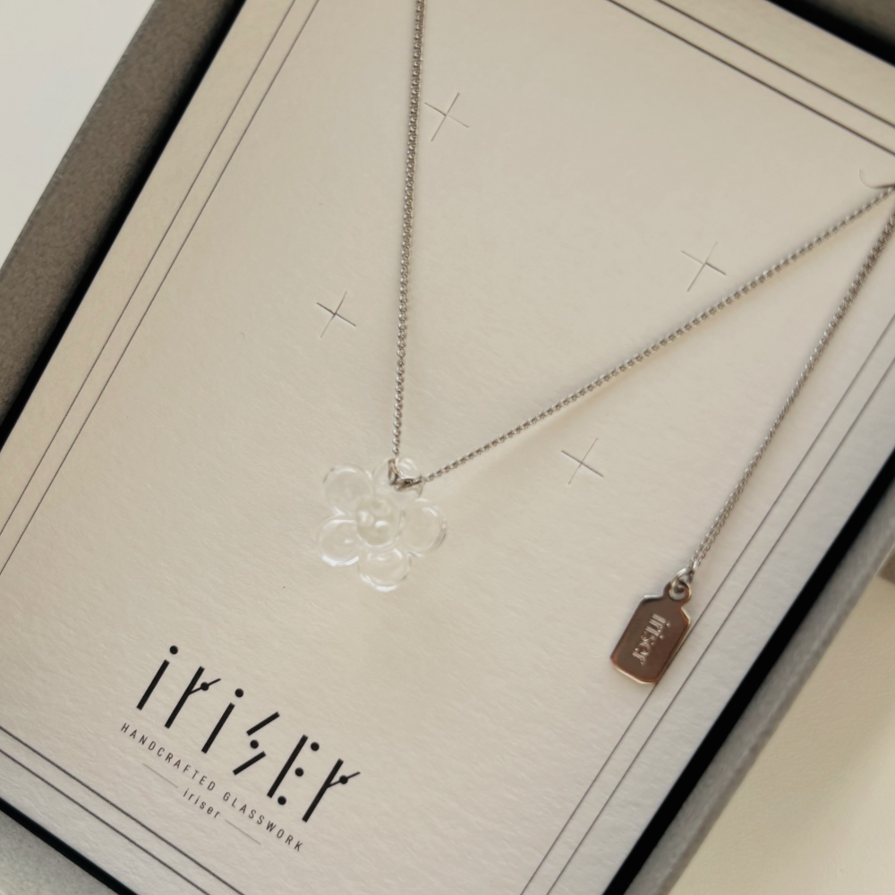 iriserのある南相馬市小高区のまちの花・紅梅をモチーフにしたガラスのネックレス。