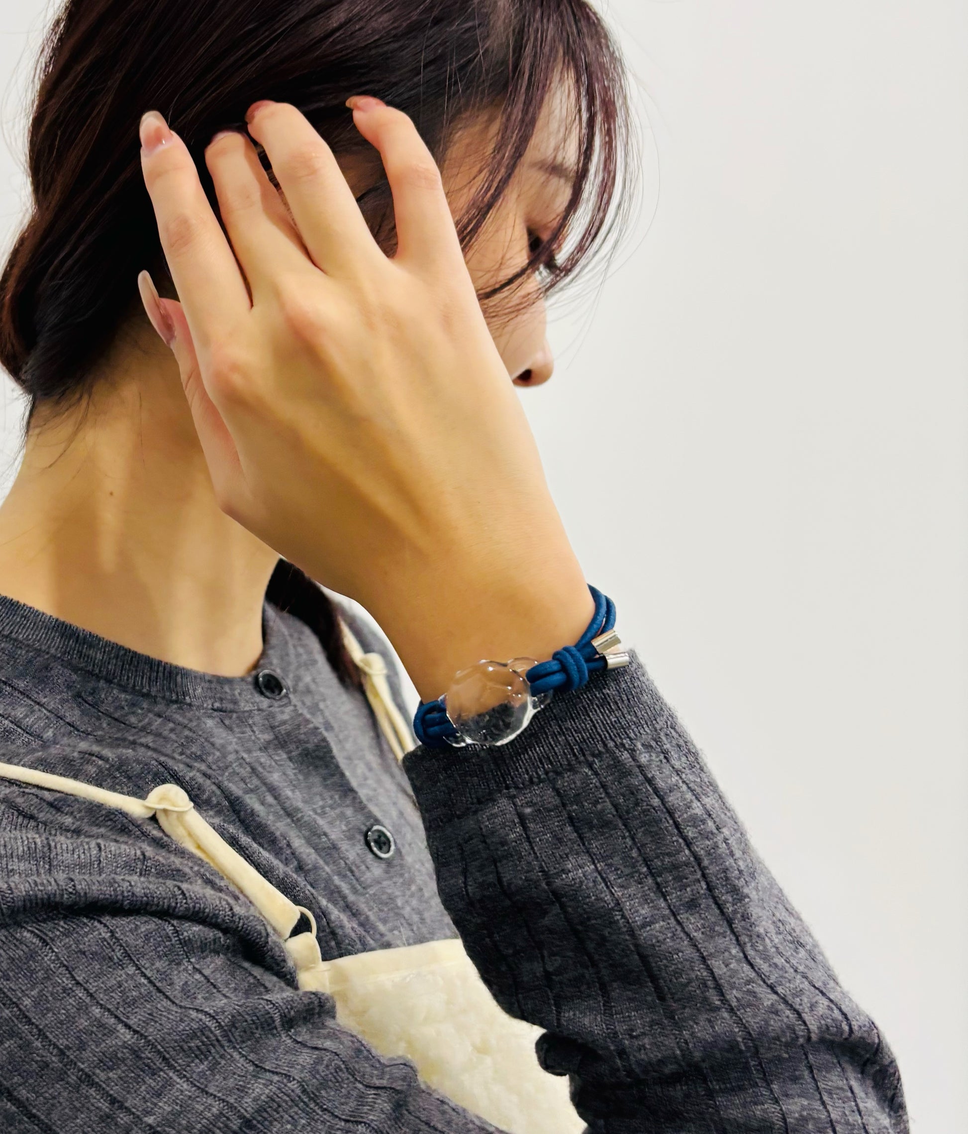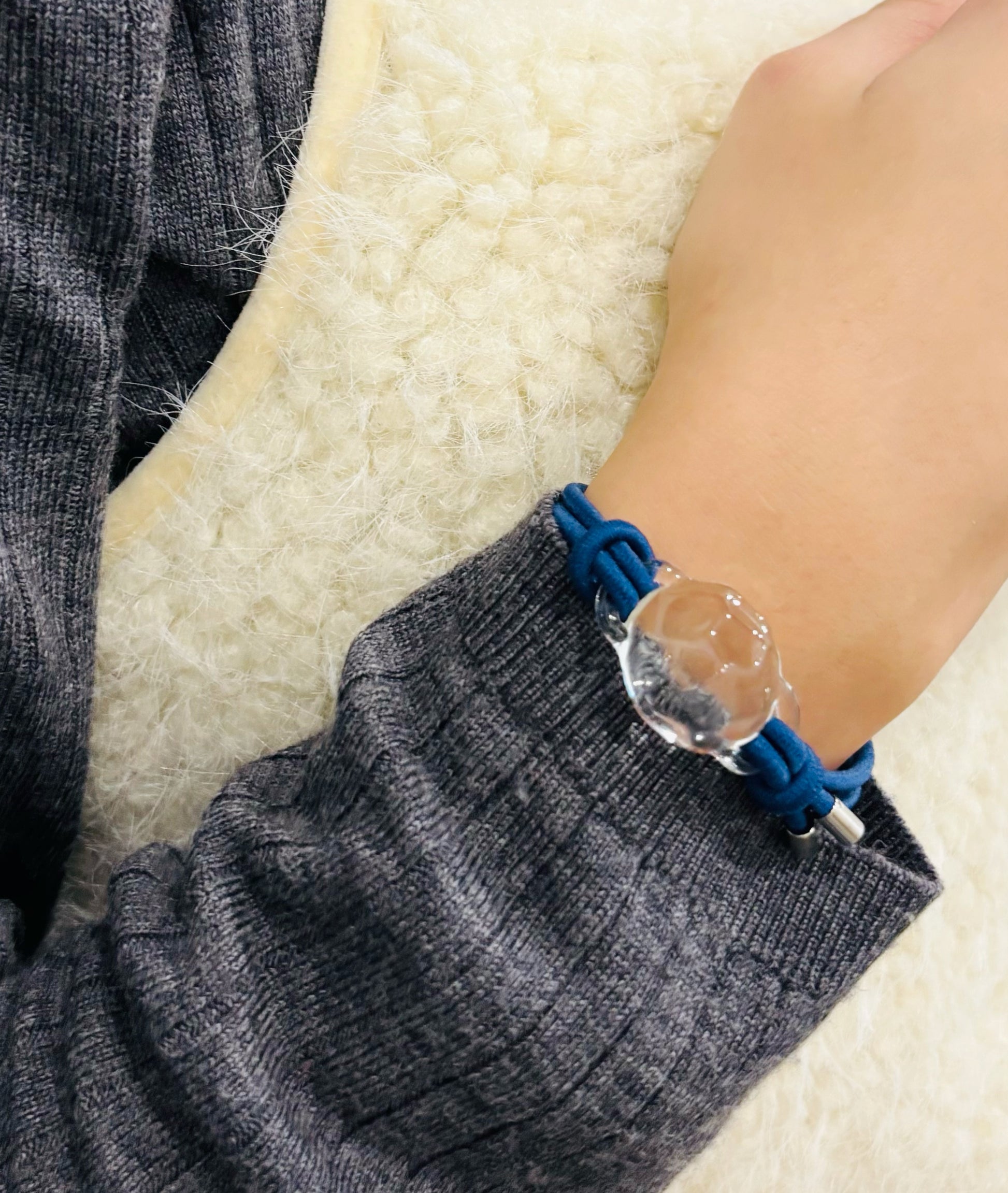 落ち着きのあるブルーカラーのゴムを重ね、シルバーの留め具を添えたデザインは、腕に通せばブレスレットに早変わり。