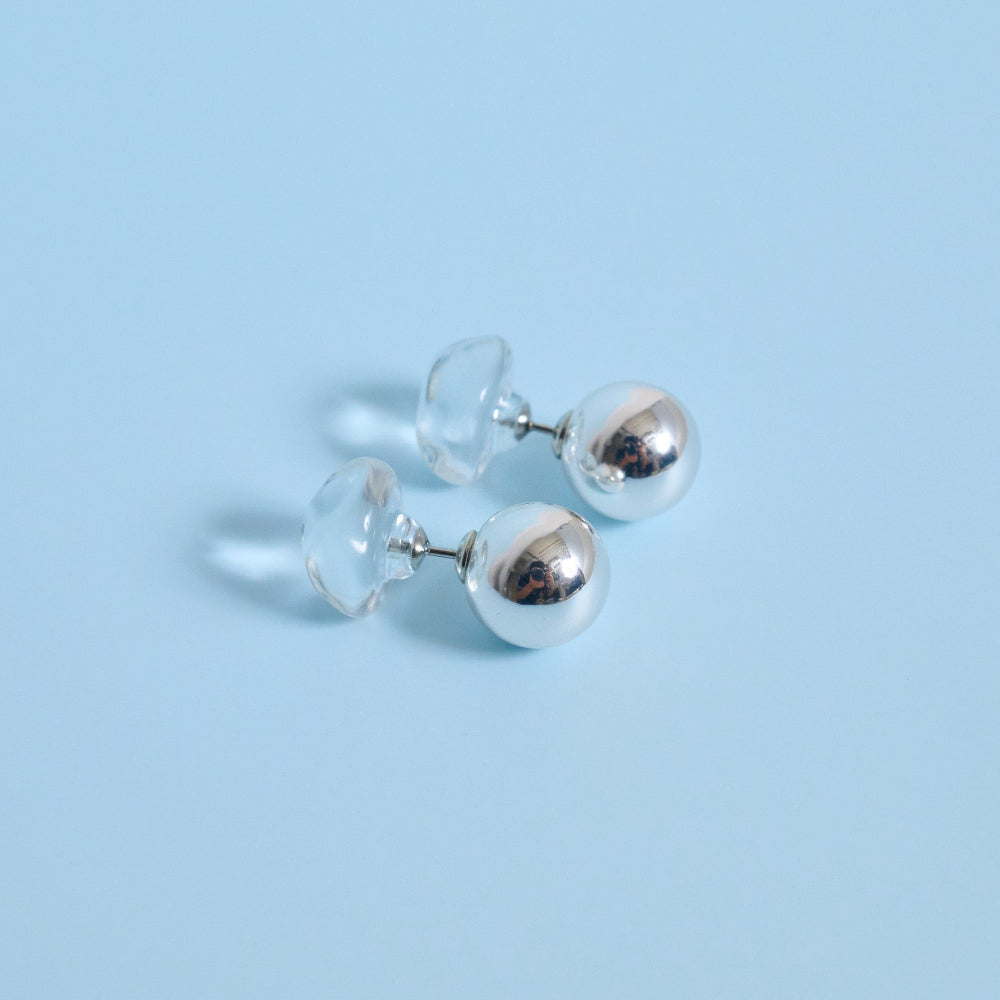 ピアスは、シルバーのパールキャッチを使用しており、前後への付け替えなども可能な遊びごころのあるデザインです。