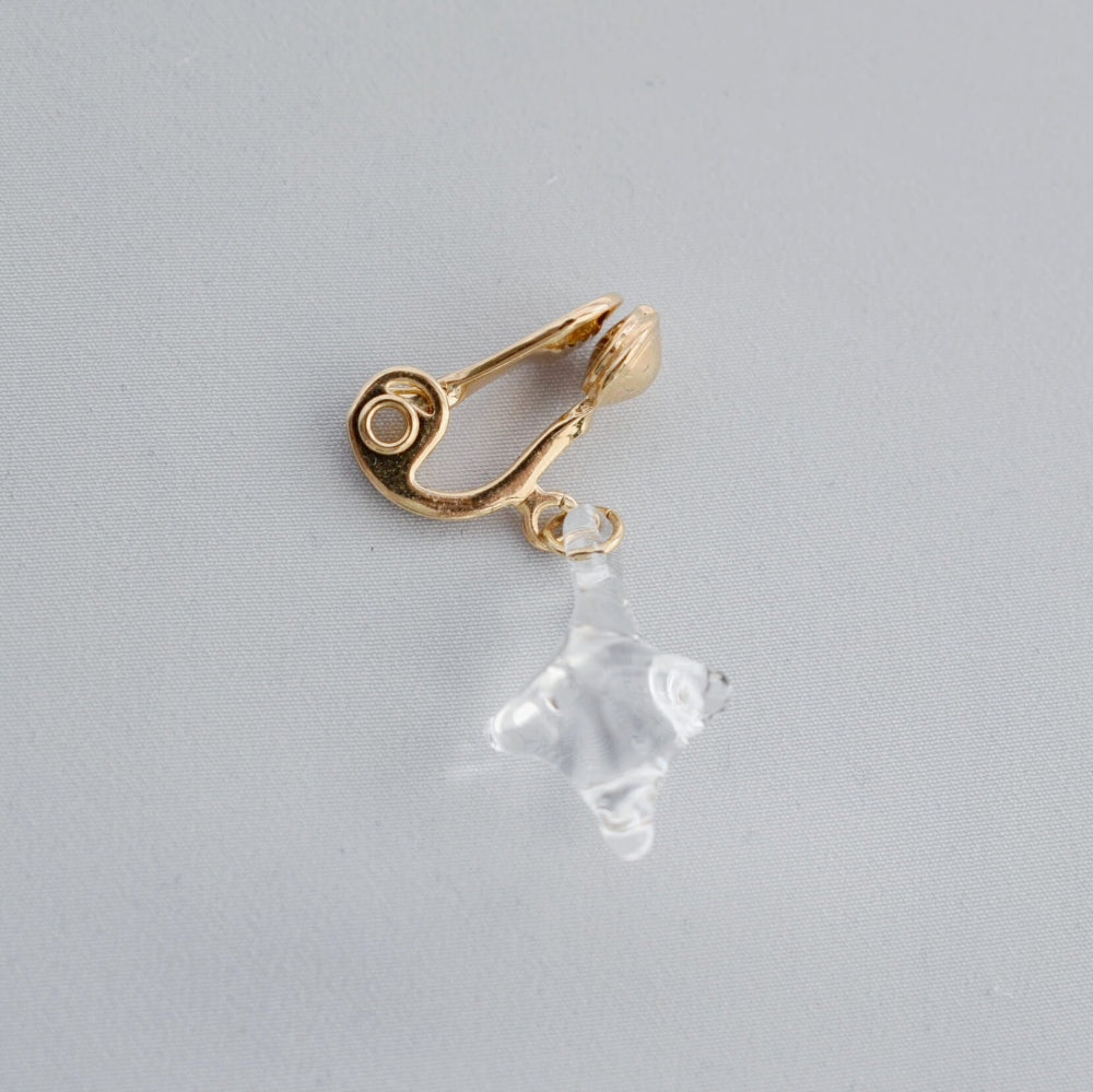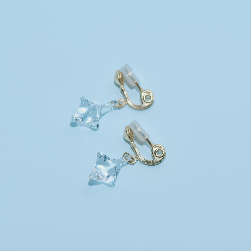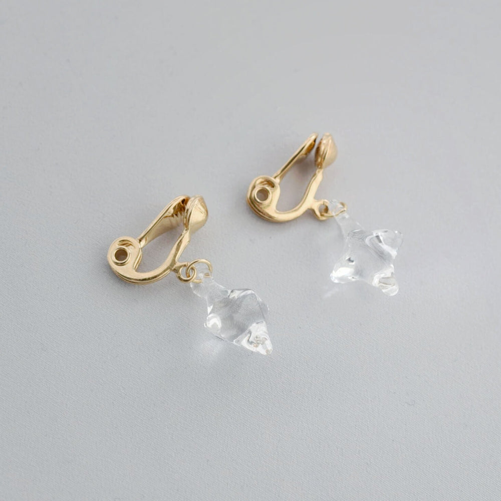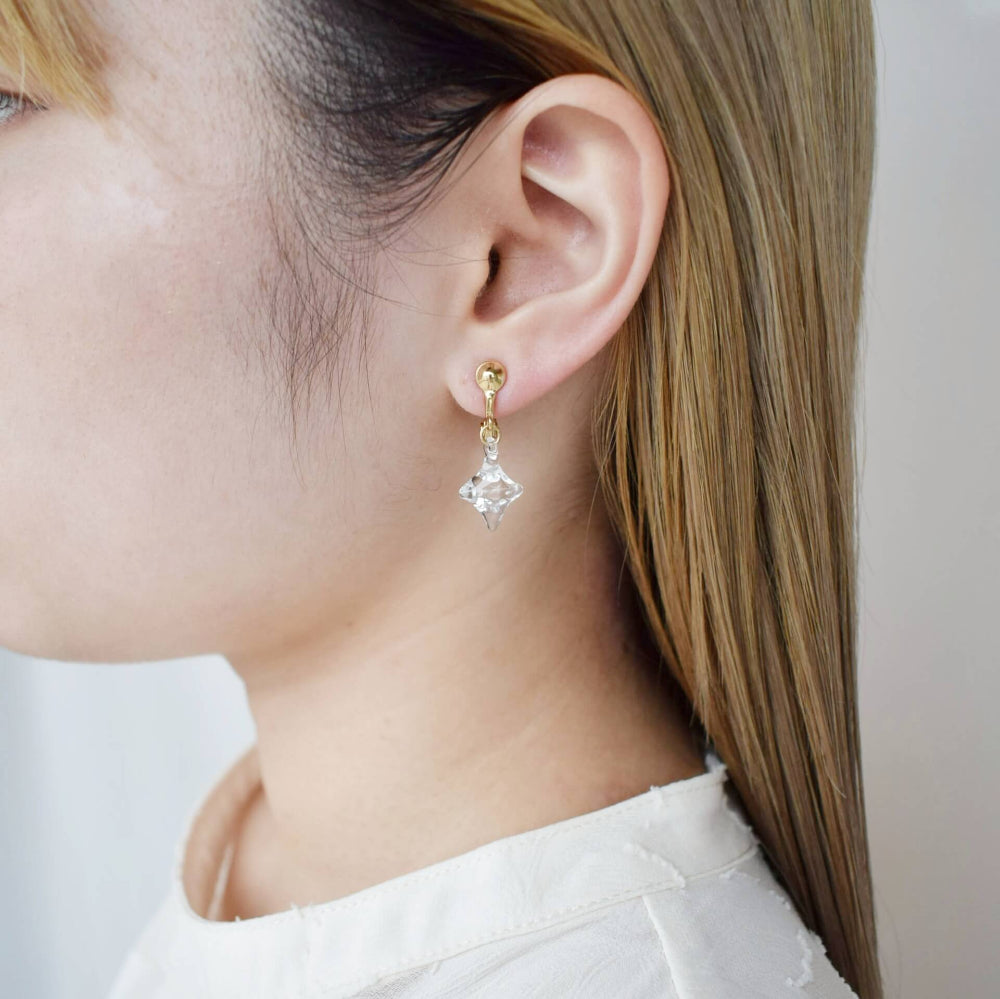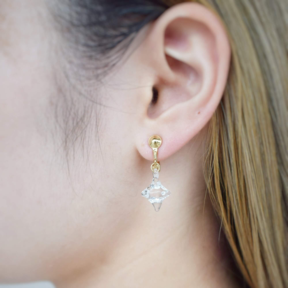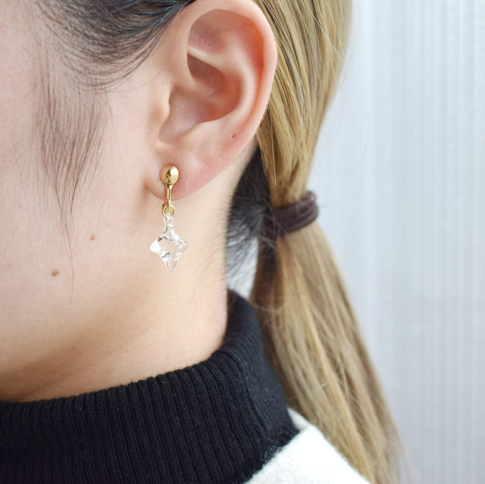イヤリングパーツには、耳の厚みに合わせて微調整が可能なカシメ式のパーツを使用しています。