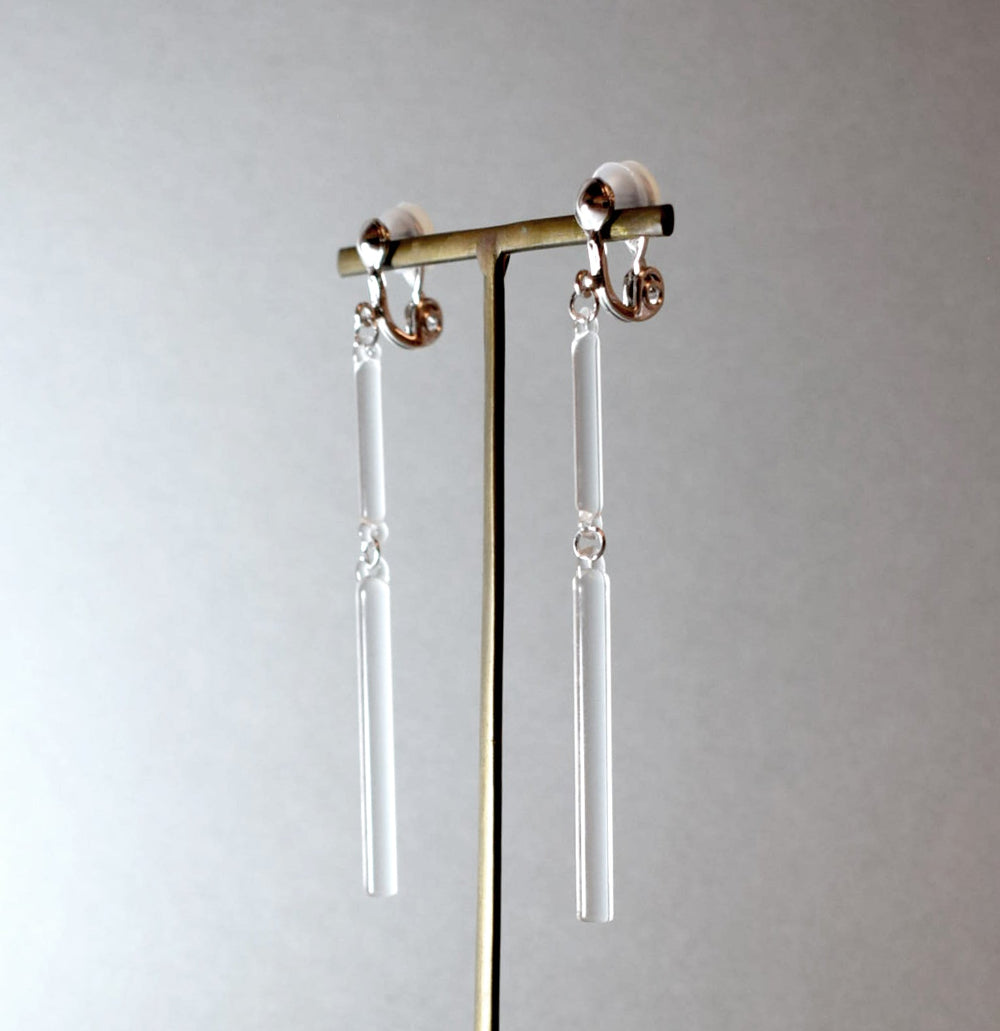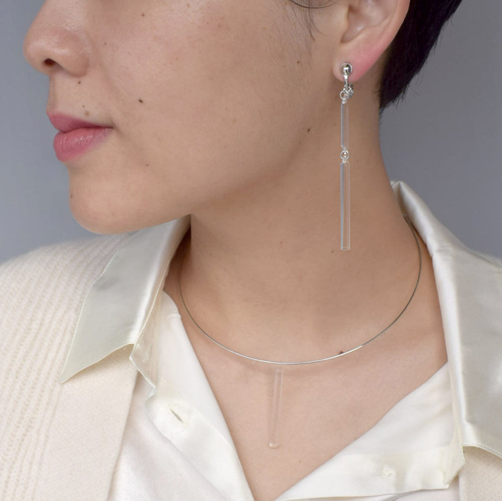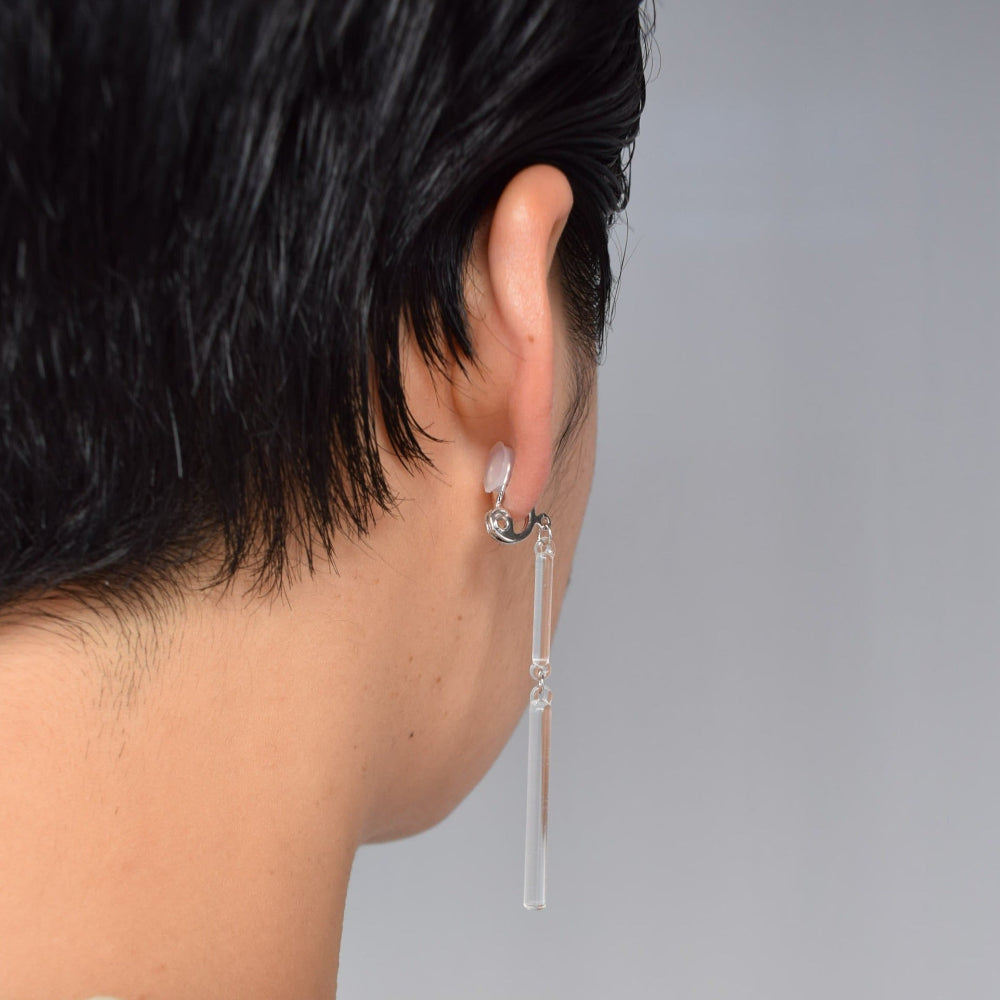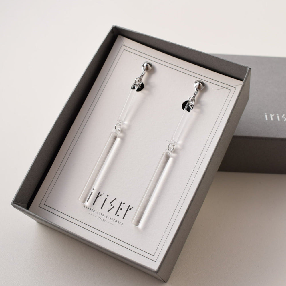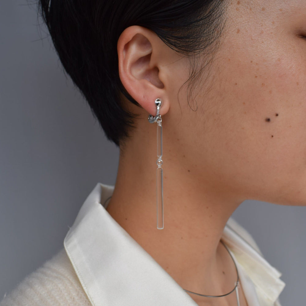直線的なガラスとシルバー色の金具で、スタイリッシュに仕上げたイヤリング。