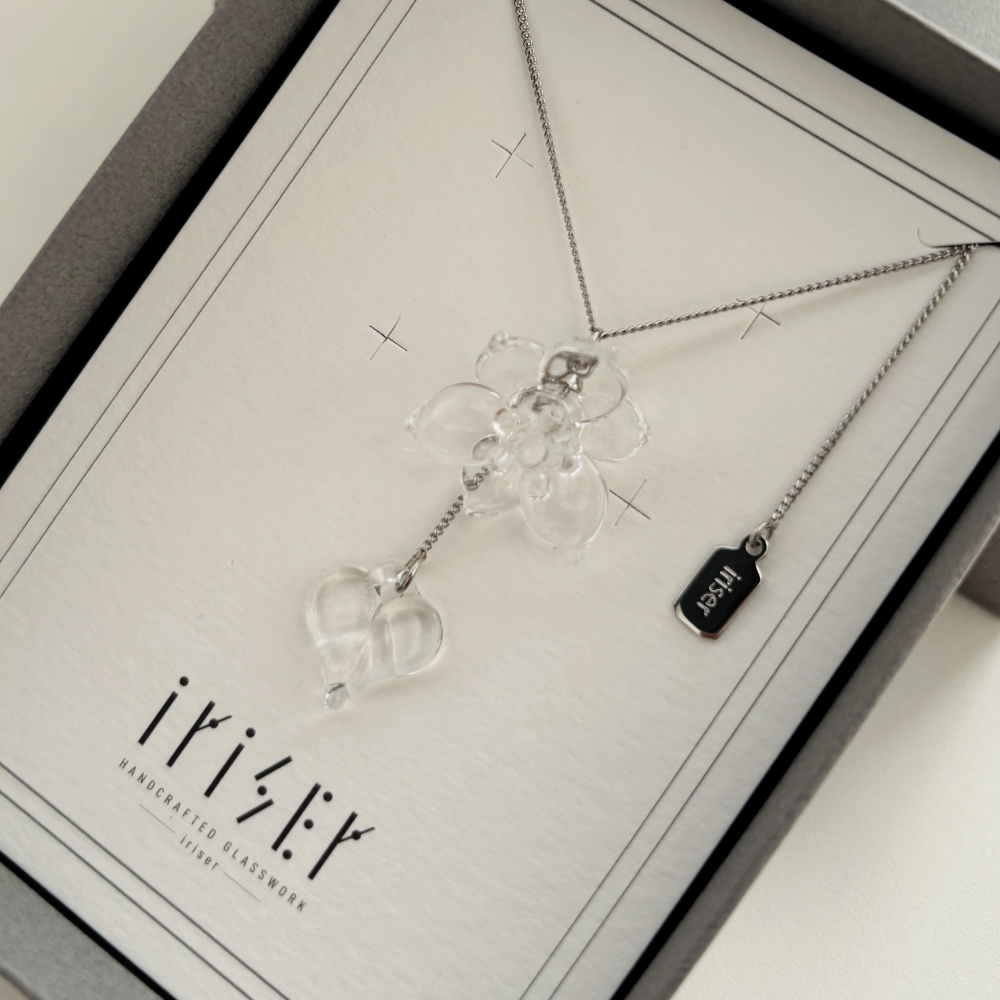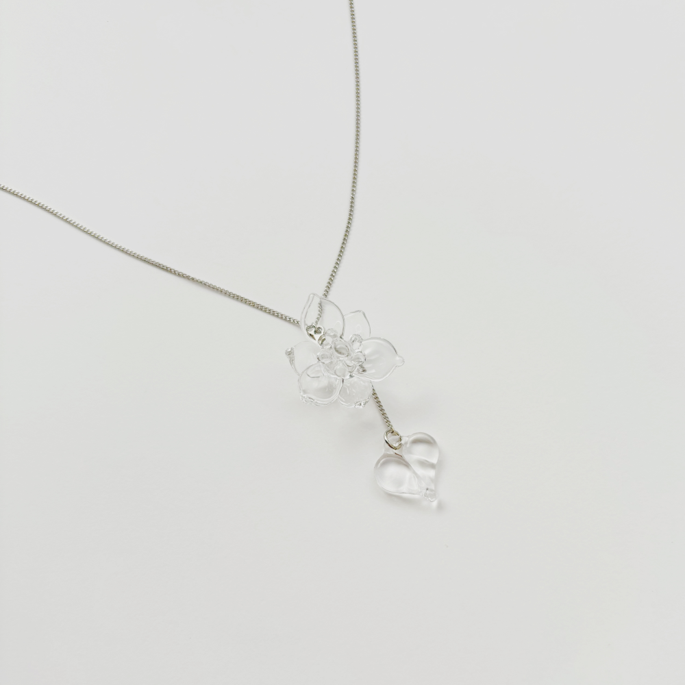 ガラスサイズ:[花]20×20×13(mm)/[葉っぱ]12×15(mm) チェーン長さ:50cm(スライドボール使用) ぶらさがり部:27mm |